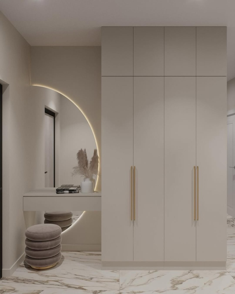 Oversized arched mirrors with hidden lighting create a halo effect, softening the atmosphere and enhancing the space’s elegance. Tall cream cabinetry with slim gold handles maintains cohesion and serenity, framing the vanity and wardrobe in a boutique-hotel style. The soft illumination highlights textures and finishes without overwhelming the room. This design demonstrates how wardrobe and storage areas can accentuate a bedroom’s personality, offering both functional organization and subtle theatricality, creating a calming, elevated space that balances form and function beautifully.
