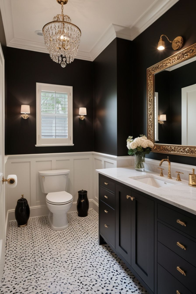 Start with matte black tiles or a bold black vanity as a statement piece. Pairing these with gold or brass accents enhances the opulent feel. Lighting is crucial—consider soft ambient lighting combined with a dramatic chandelier or wall sconces to elevate the space.