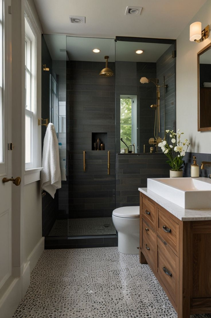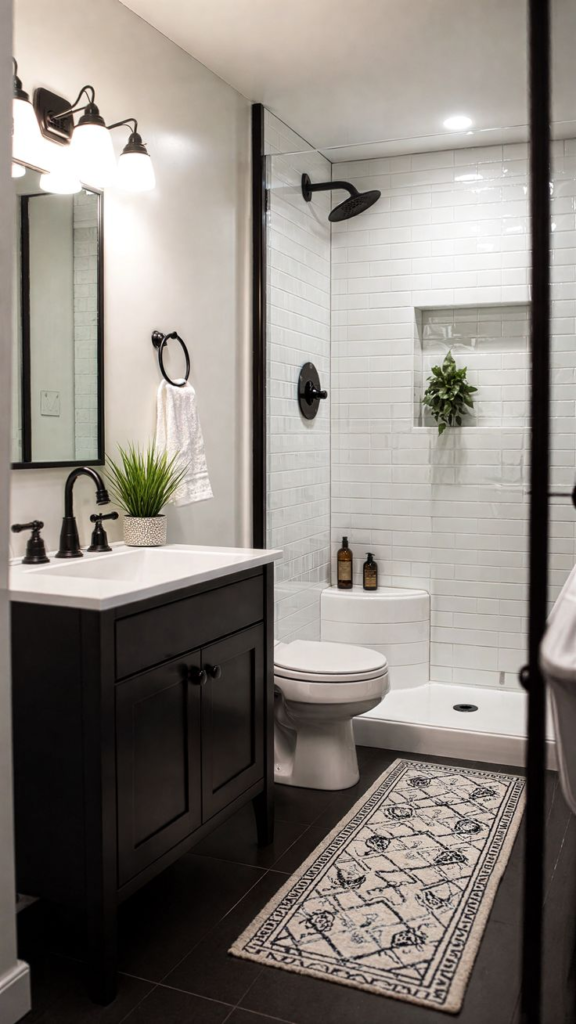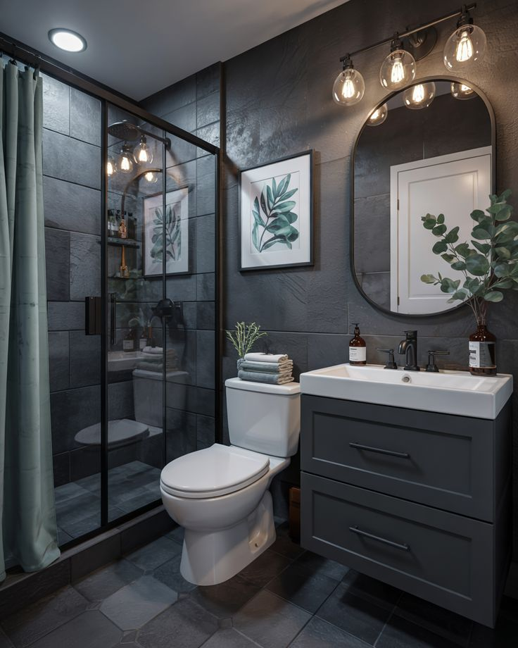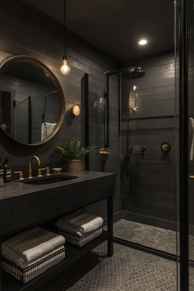 Adding reflective surfaces like mirrors or glossy tiles can enhance the room’s depth and bring in light, preventing the space from feeling too dark. Pairing black with soft grays, whites, or muted metallics maintains a balanced, stylish look.