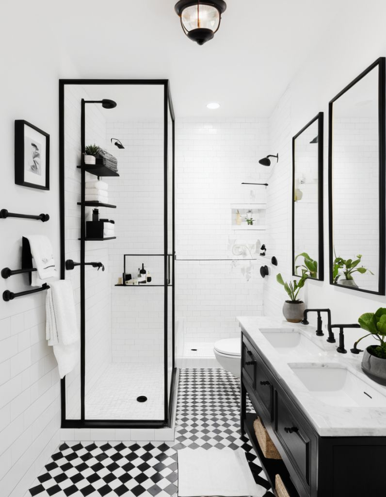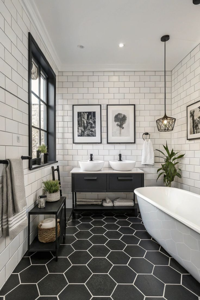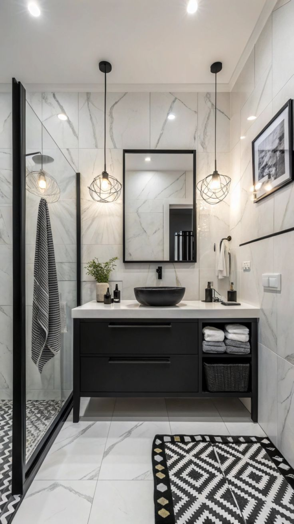Statement pieces, like a black freestanding tub or a floating vanity, can make the room memorable. Complementing these with softer elements, such as natural wood accents or plush textiles, ensures the bathroom remains comfortable and inviting.