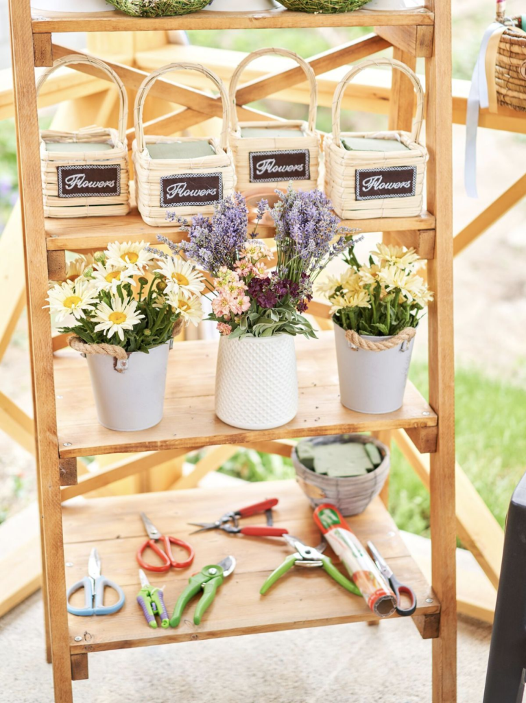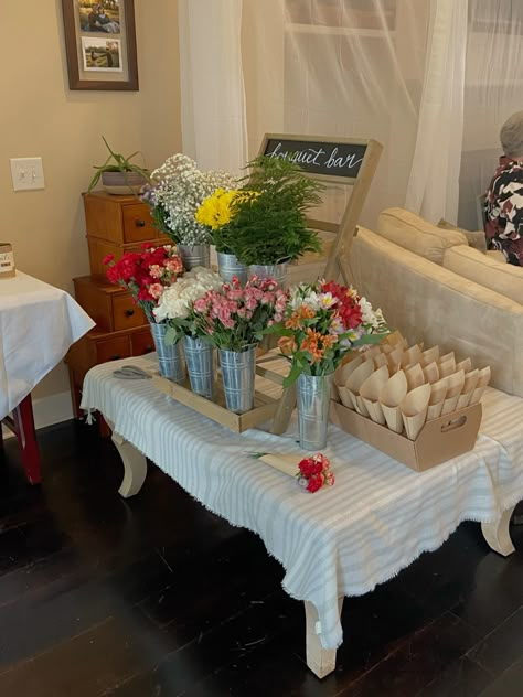 A traditional DIY bouquet station is one of the easiest and most crowd-pleasing ways to incorporate flowers into any gathering. The concept is simple: set out buckets filled with fresh blooms, a variety of greenery, floral scissors, twine, and wrapping paper so guests can design their own take-home bouquet.