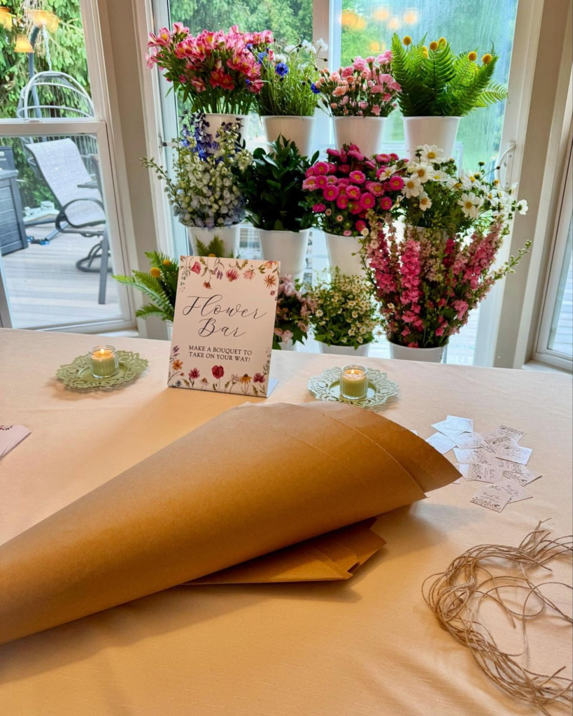 Hosting a bloom bar doesn’t require luxury florals. Grocery store flowers can look stunning when styled thoughtfully. Mixing affordable blooms with greenery and cohesive wrapping materials elevates the overall presentation.