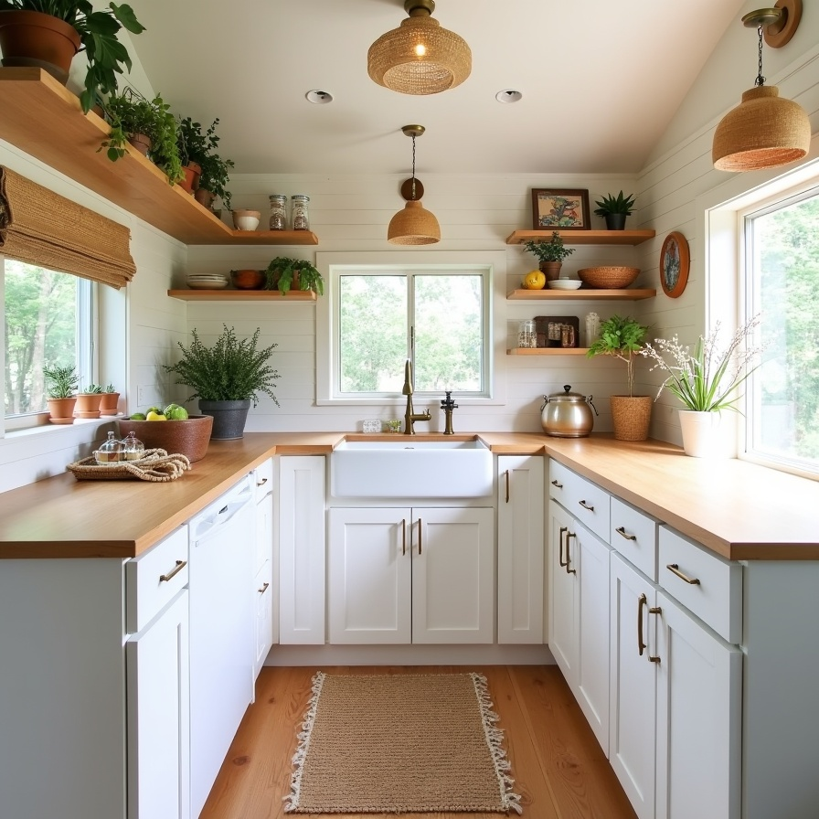 This RV kitchen embraces a relaxed boho-chic vibe with airy white cabinetry, warm wood countertops, and brass accents. Rattan pendant lights and open shelving add texture while keeping the space light and inviting. Soft, natural tones flow from woven rugs to potted greenery, creating a cozy yet uncluttered atmosphere. Every element feels purposeful, from the layered textures to the subtle details, making the compact kitchen feel curated and effortless, perfect for RV living with style and comfort.