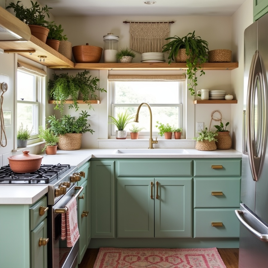 Sage green cabinets paired with brushed gold hardware bring charm and warmth to this boho-inspired RV kitchen. Layered textures, including woven baskets, ceramic pots, and brass accents, create a collected, personal feel. A patterned rug in soft pinks and neutral tones adds warmth underfoot, while open shelving displays fresh herbs and greenery. Macramé wall hangings and handmade details tie the look together, creating a space that is cozy, welcoming, and perfectly balanced between boho flair and functional RV design.