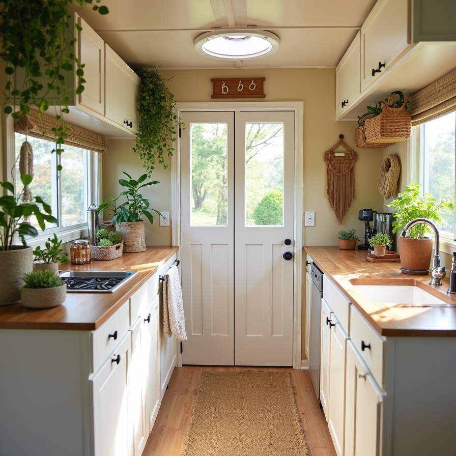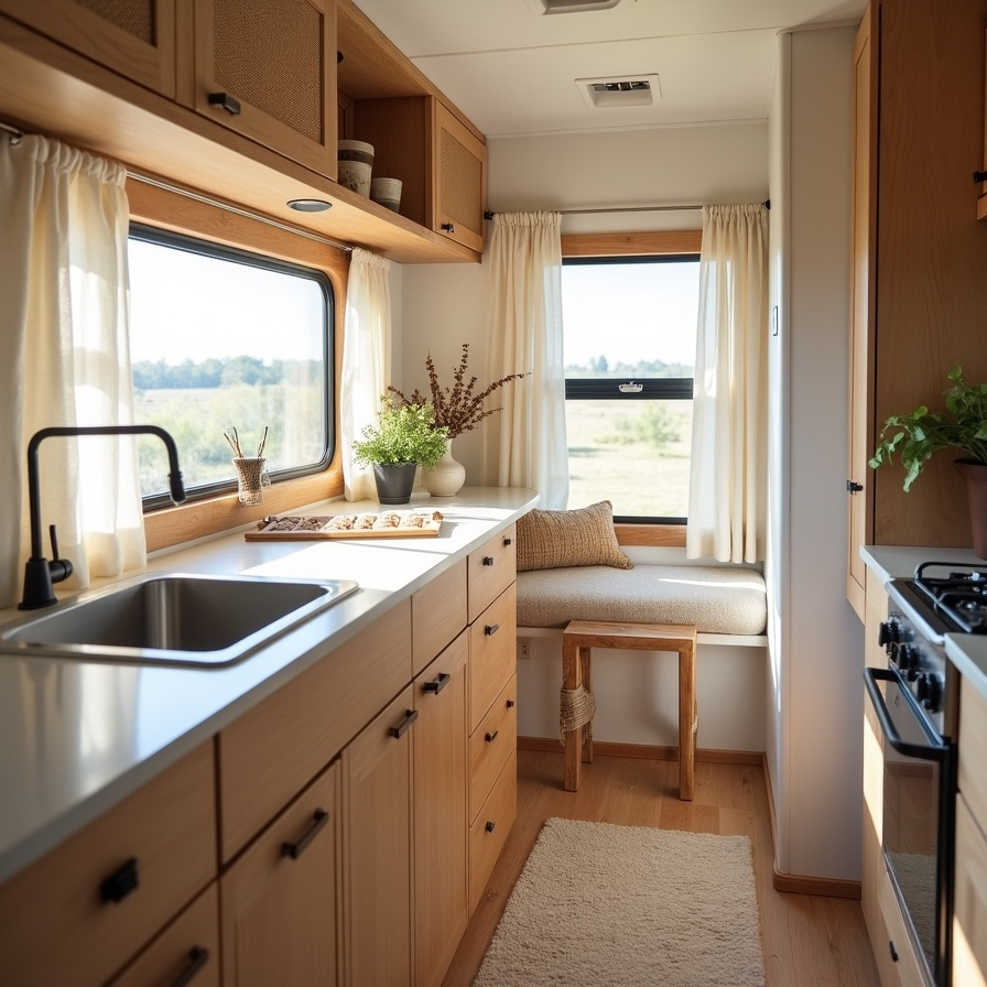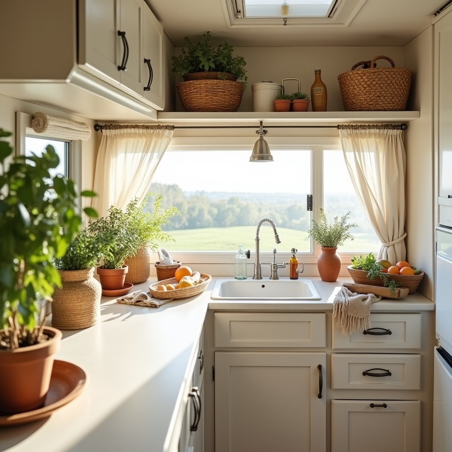Sunlight pours into this RV kitchen, creating a bright, peaceful retreat. Soft white cabinetry, linen curtains, and natural wood accents combine for a warm, welcoming environment. Potted herbs, woven baskets, and small greenery details bring life and a lived-in charm to the compact space. Airy textures and neutral tones enhance the sense of openness, making the kitchen feel larger than it is. Every element is carefully curated to maximize light, comfort, and practical functionality while maintaining boho warmth.