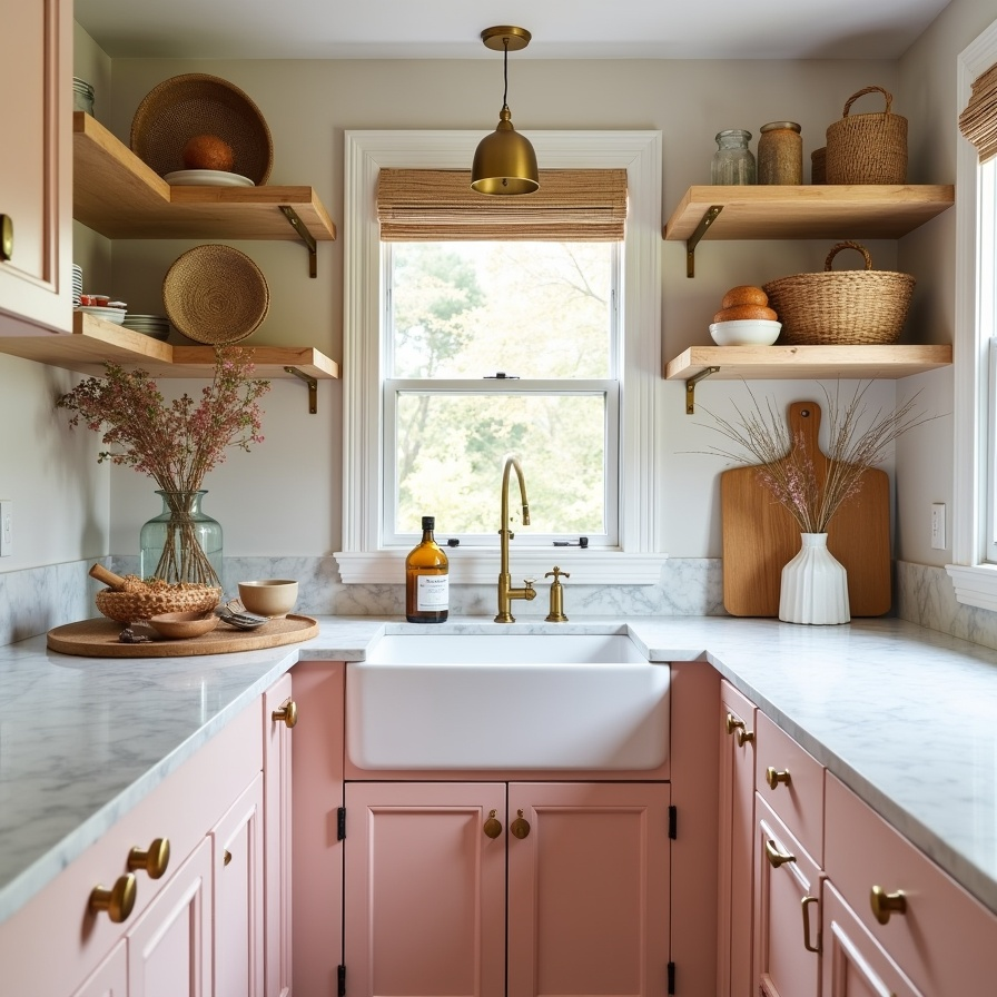 5. Blush-Toned Cabinets and Woven Wall Baskets