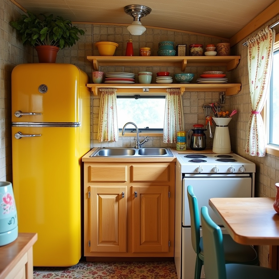 Mint green cabinets, soft yellow accents, and warm wood details bring playful retro charm to this camper kitchen. Patterned textiles, layered rugs, and hanging plants add vibrancy and personality. The retro stove, quirky valances, and nostalgic elements evoke cheerful nostalgia, while herbs and potted greenery maintain freshness. Despite its small size, the kitchen feels intentional and curated, blending boho warmth with vintage camper personality for a lively, inviting space perfect for road trips or small living.