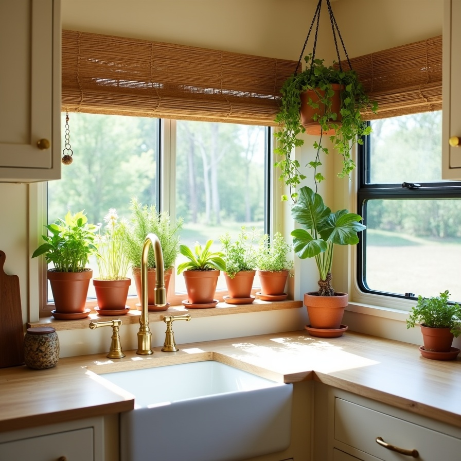 This serene boho RV kitchen corner features creamy cabinetry, brass fixtures, and a farmhouse sink that anchors the space. Bamboo shades filter morning sunlight, creating soft, natural illumination. Terracotta pots line the windowsill with herbs and trailing vines, while a hanging planter adds vertical interest and life. Subtle movement and shadows from leaves dancing across walls evoke a calming, almost poetic ambiance. The combination of natural textures, soft tones, and thoughtful details makes this kitchen a peaceful, warm, and inviting retreat.