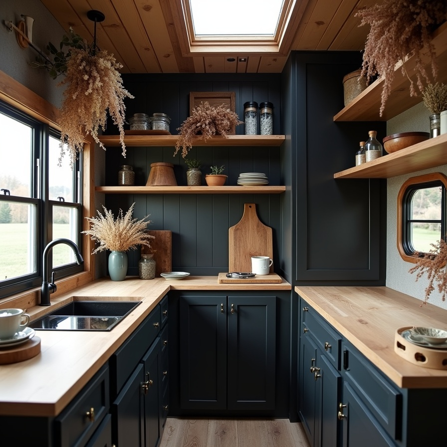 Matte black cabinetry and warm wood countertops set the stage for a moody boho RV kitchen. Natural light from the window and skylight softens the darker palette, creating an inviting, cozy space. Dried floral arrangements drape from the ceiling and walls, adding texture and romantic charm. The eclectic mix of tones and stems balances drama with warmth, while open shelving and small accent pieces maintain functionality. This design shows how moody colors can be paired with boho textures to achieve a rustic, timeless aesthetic.