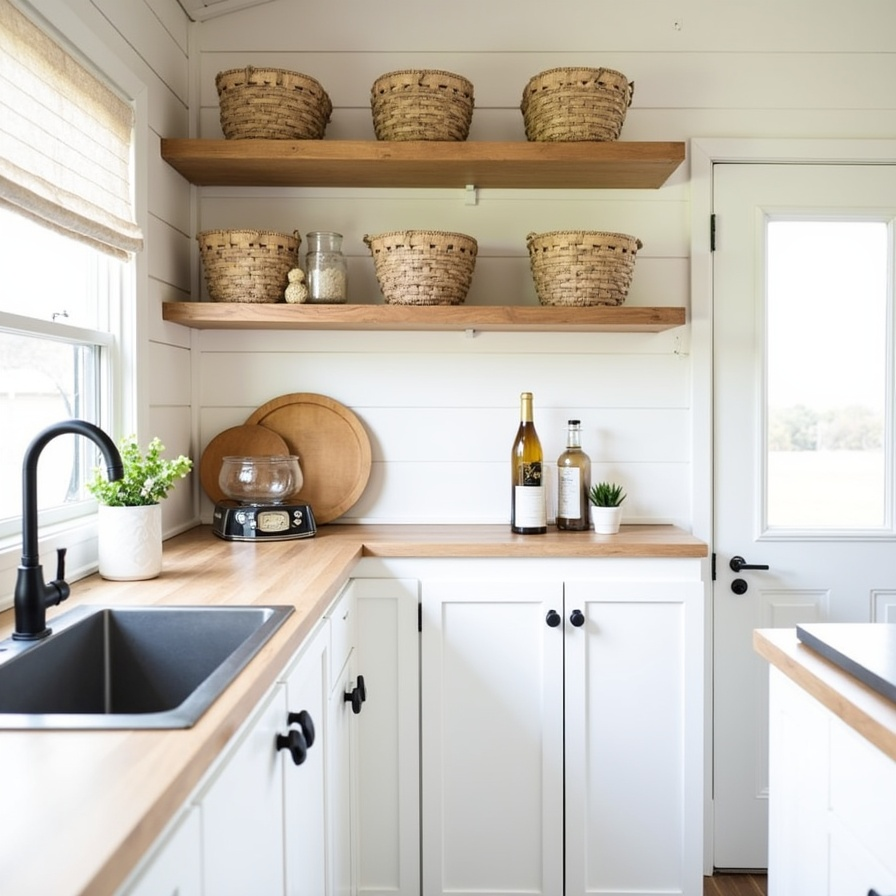 Crisp white shiplap walls provide a light, airy backdrop in this boho farmhouse RV kitchen. Soft wood countertops and open shelving lined with woven baskets offer practical storage and visual interest. Matte black hardware provides grounding contrast, while small potted plants and textured cutting boards introduce subtle warmth. The overall design balances functionality with charm, making the compact space feel welcoming, organized, and effortlessly styled in a modern boho-farmhouse aesthetic.