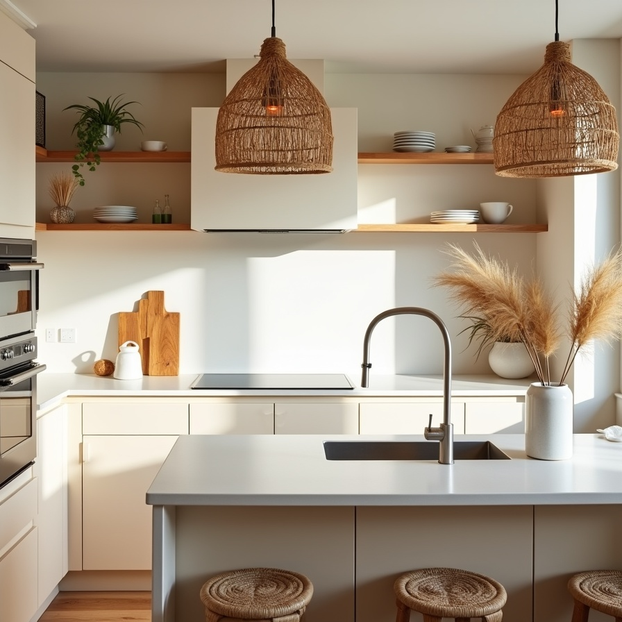 Neutral tones and natural textures define this warm, serene RV kitchen. Woven pendant lights and bar stools contribute organic, cozy touches, complementing beige cabinetry and white countertops. Wooden accents and dried grasses in a ceramic vase add quiet, subtle detail without cluttering the space. Sunlight streams across surfaces, enhancing the warm palette and creating a calm, inviting atmosphere. This kitchen embodies the essence of boho minimalism, where simplicity and texture come together to form a soft, welcoming environment.