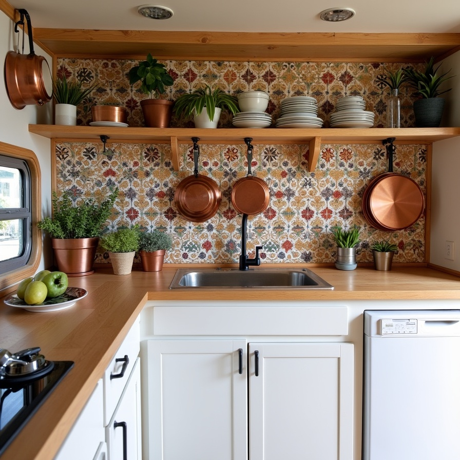 A Moroccan-style tile backsplash brings vibrant color and texture to this boho RV kitchen. Warm wood countertops and white cabinetry create balance, while copper cookware hung from iron racks adds functional flair and artisanal charm. Open wood shelving above provides space for plants, everyday dishes, and kitchen essentials, keeping the kitchen light and organized. The earthy palette and layered textures give the space depth, personality, and a cozy, lived-in quality, making it both visually appealing and highly functional.