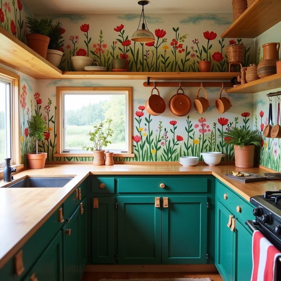 12. Artistic Kitchen with Painted Mural and Clay Accessories