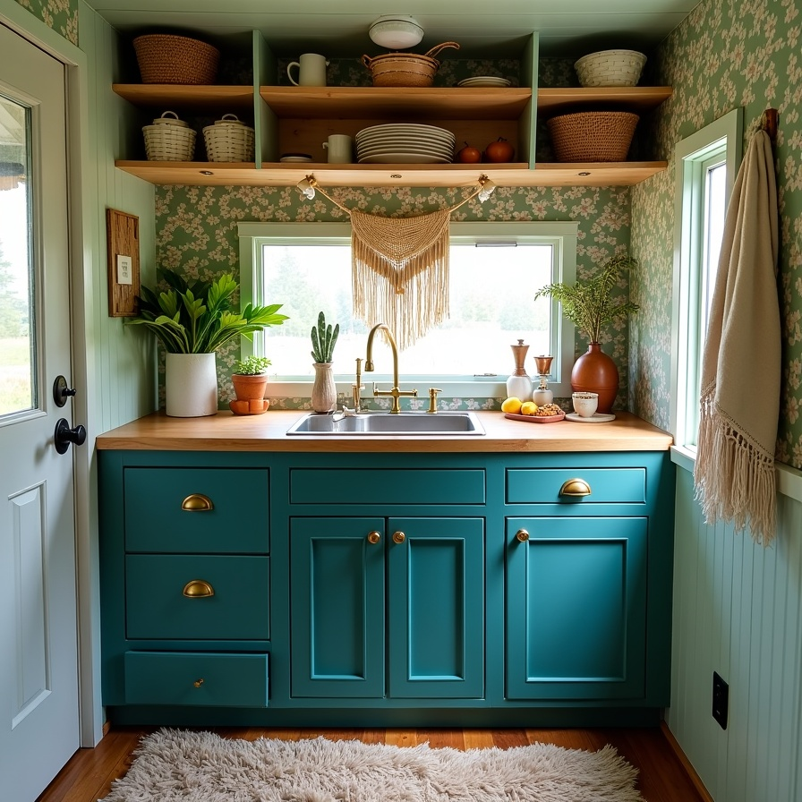 Deep teal cabinetry paired with brass hardware creates a bold focal point in this boho RV kitchenette. Warm wood countertops and open shelving add natural texture, while green floral wallpaper brings a playful, vintage-inspired backdrop. A macramé piece hanging at the window diffuses light and reinforces the boho aesthetic. Layered textures, including woven baskets, fringe towels, and a chunky rug, create a tactile, inviting environment. Every detail contributes to a cozy, curated space full of charm and personality.