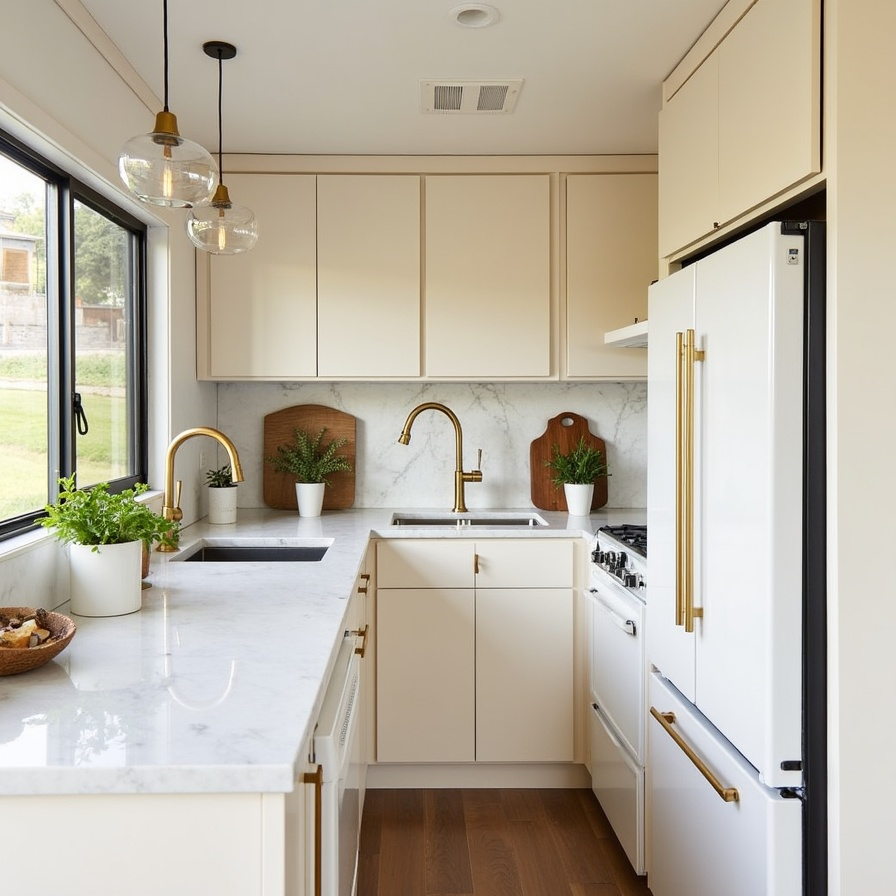 7. Cream and Gold Kitchen with Hanging Planters