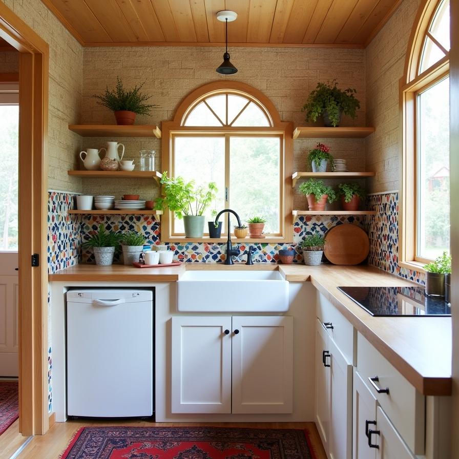 This boho kitchenette bursts with energy through colorful mosaic tiles and playful arched windows. White cabinetry and warm wood accents balance the vibrant tones, while open shelving displays ceramics and kitchen essentials. Small potted herbs add freshness and life. A vintage-style rug introduces earthy reds and navy, anchoring the space underfoot. The result is a cozy, cheerful kitchen that feels lively yet grounded, perfect for compact RV layouts that prioritize personality, function, and style.