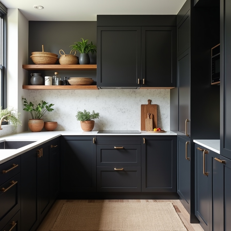 Matte black cabinetry, deep charcoal tones, and textured finishes create a modern monochrome boho kitchen. Soft gray upper cabinets provide contrast, while natural wood accessories add warmth. Woven baskets, cutting boards, and layered textures soften the dark palette, ensuring the space feels elevated but approachable. Interplay of light and shadow across the textured surfaces adds depth and visual interest. This design showcases how boho style can exist in a minimalist, monochromatic palette without sacrificing personality or comfort.