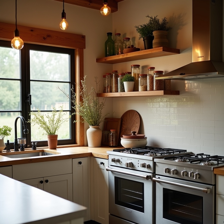 Natural textures, soft lighting, and open shelving define this earthy boho kitchen. Smooth wooden shelves hold neatly arranged jars, while Edison bulbs cast a warm glow. Black-framed windows bring in fresh outdoor views, balancing rustic interiors with natural light. Simple bowls, wildflowers, and ceramic vases enhance the cozy, grounded atmosphere. Built-in storage keeps the space organized without feeling crowded, creating a calming, functional, and visually appealing kitchen that embodies the organic, relaxed spirit of boho design.