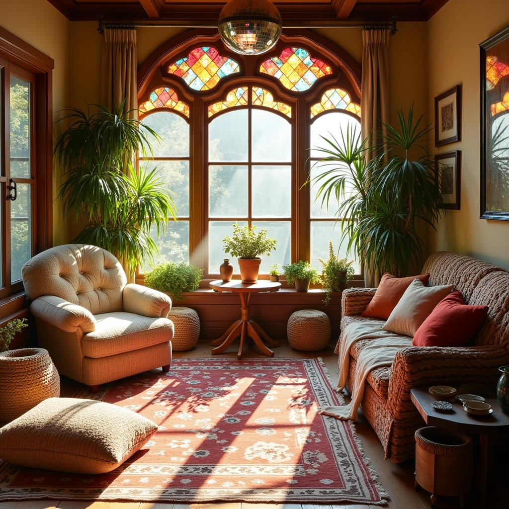 Sunlight streams through stained glass, casting colorful reflections across rugs and furniture. Macramé planters sway gently, and cozy pillows and throws invite relaxation. A disco ball adds subtle sparkle.
