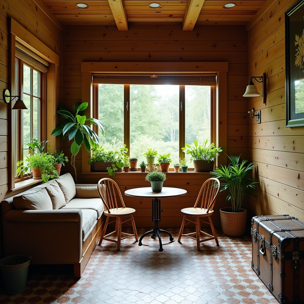 Wood walls create a cozy cabin feel, while patterned floor tiles add whimsical contrast. Plants line the windowsill, and a vintage trunk grounds the room. A small bistro set invites leisurely mornings.