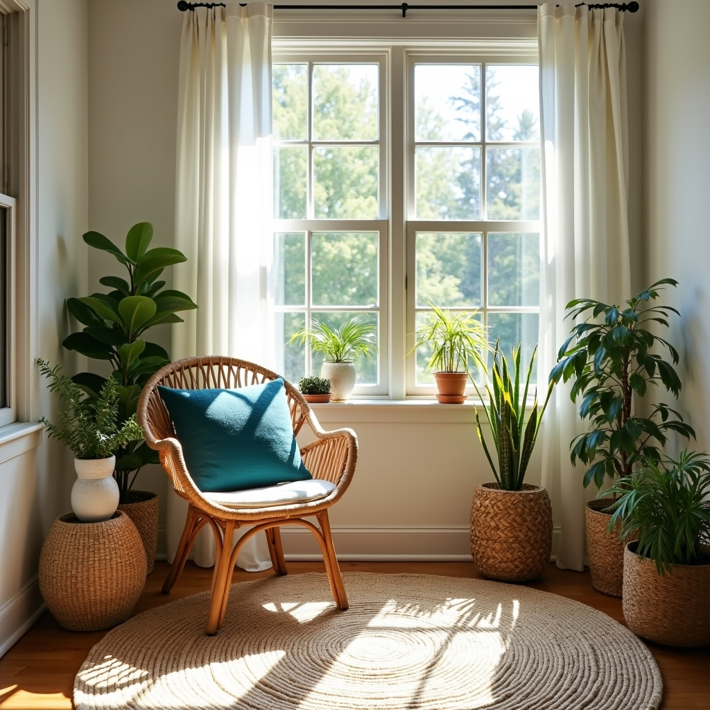 Minimalism meets boho in this serene sunroom. One rattan chair, a jewel-toned cushion, and a simple jute rug provide understated charm. Plants add color and life without overwhelming the space.