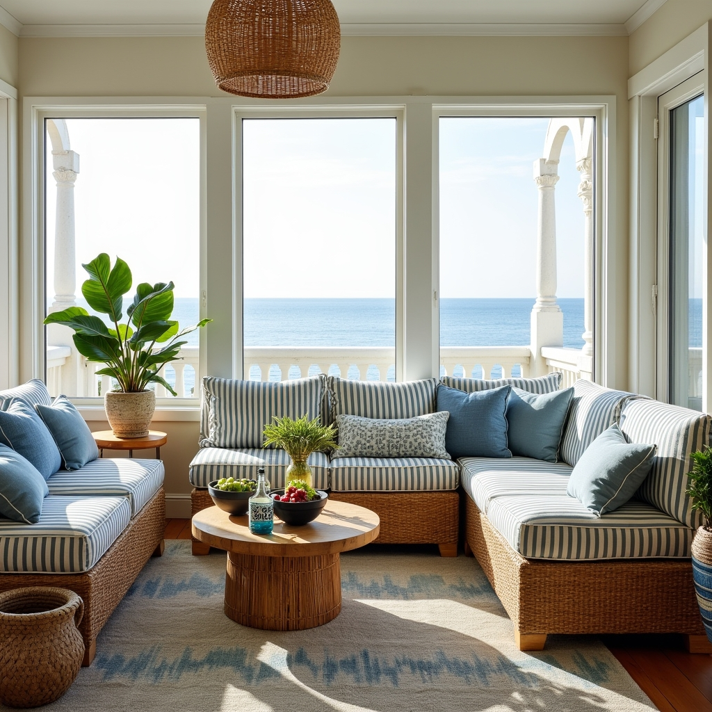 Stripes, wicker, and ocean-inspired textures define this airy, coastal boho sunroom. The horizon stretches beyond the glass, and sculptural accents add interest. Bowls of grapes and chilled drinks suggest leisurely moments in an effortless, breezy environment.