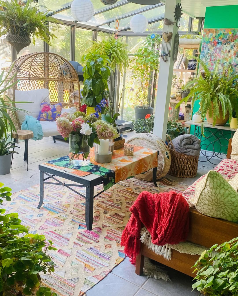 The energy is electric—nothing matches perfectly, yet everything belongs. The room encourages play and imagination, making it less a sunroom and more an artist’s living space. Each corner hums with inspiration, capturing the essence of boho creativity at its most expressive.