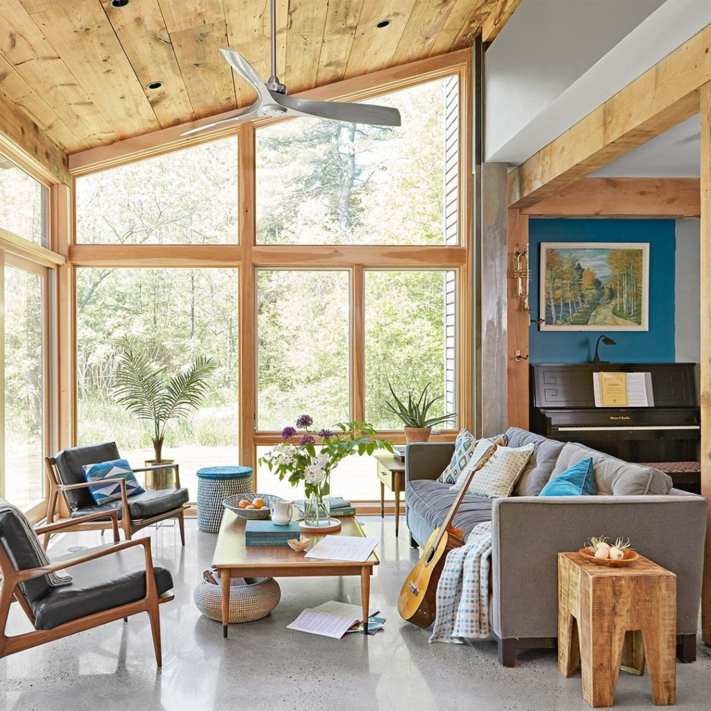 This sunroom perfectly blends modern structure with boho warmth. Expansive windows frame the lush outdoors, turning greenery into a living backdrop. Clean wood lines and sleek beams provide a grounding contrast, while woven stools, cozy throws, and a casually placed guitar soften the edges.