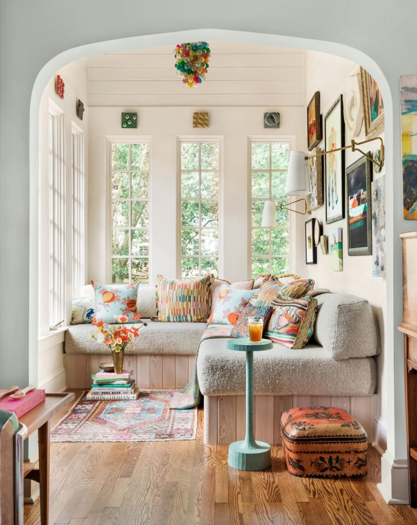 This intimate sunlit alcove bursts with personality. A built-in sofa overflows with pillows in vivid patterns, and a gallery wall brings a playful mix of prints and artwork to every inch. Florals, stripes, and a small layered rug anchor the space, creating a cozy, energetic corner.
