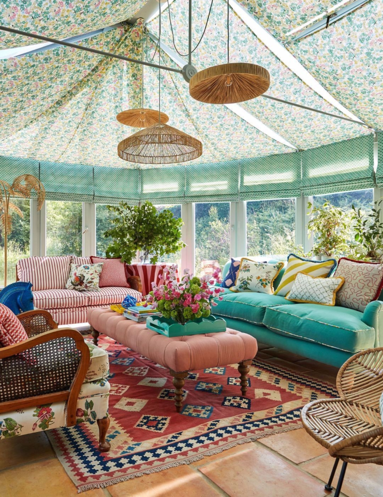 For anyone who loves visual exuberance, this sunroom is a delight. Striped sofas meet floral armchairs, geometric rugs create rhythm underfoot, and even the ceiling features vintage floral fabric. The room hums with playful energy, where every pattern sings in harmony.