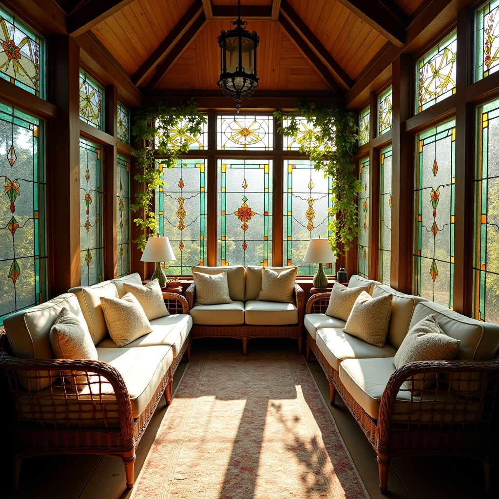Every detail tells a story: handcrafted textiles, natural wood, and artful windows merge to form a sunroom that feels alive with history and personality. It’s a space that wraps you in warmth and wonder, evoking both comfort and enchantment.