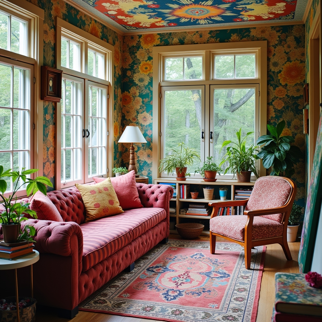 This sunroom is a canvas come to life. Murals, eclectic art, and patterned textiles fill every wall and surface with creativity. Bold colors and unfiltered design make the space feel rebellious yet cohesive.