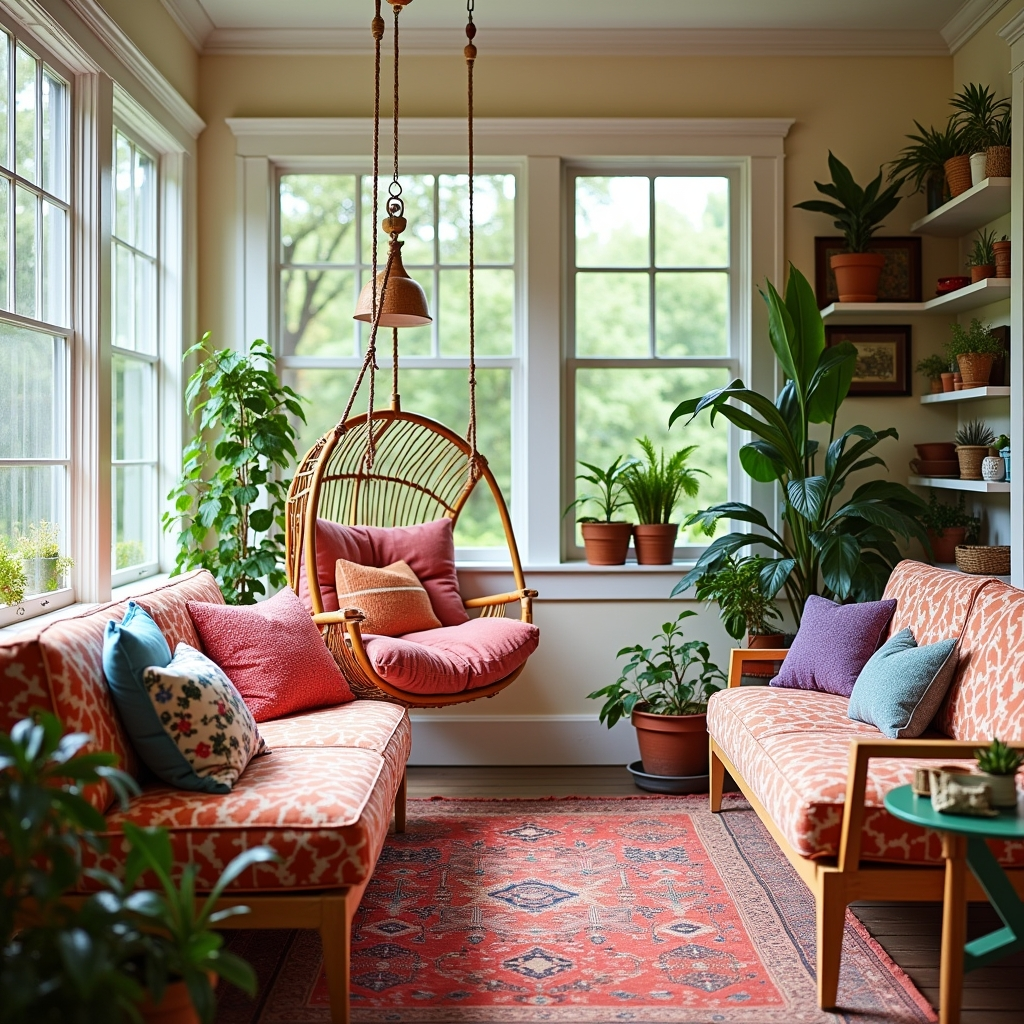 A rattan swing hangs invitingly in this lively sunroom, encouraging relaxation. Patterned sofas, bright pillows, and curated shelving add playful texture and energy.