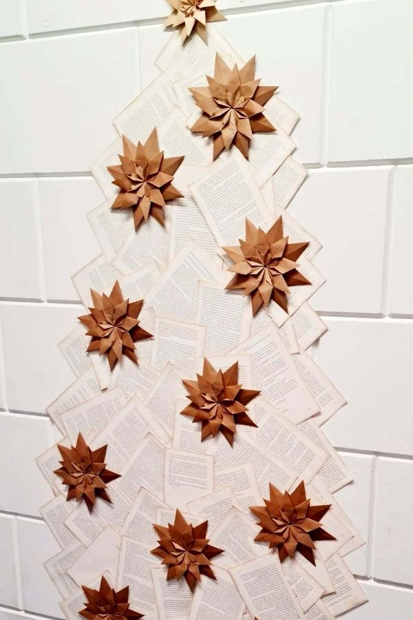 Transforming book pages into a Christmas tree wall display combines holiday cheer with literary creativity. Layered pages and folded shapes create a textured, dimensional effect that draws attention and enhances seasonal decor. The subtle contrast of soft paper tones with accent details, such as paper flowers or ornaments, adds elegance to the display.