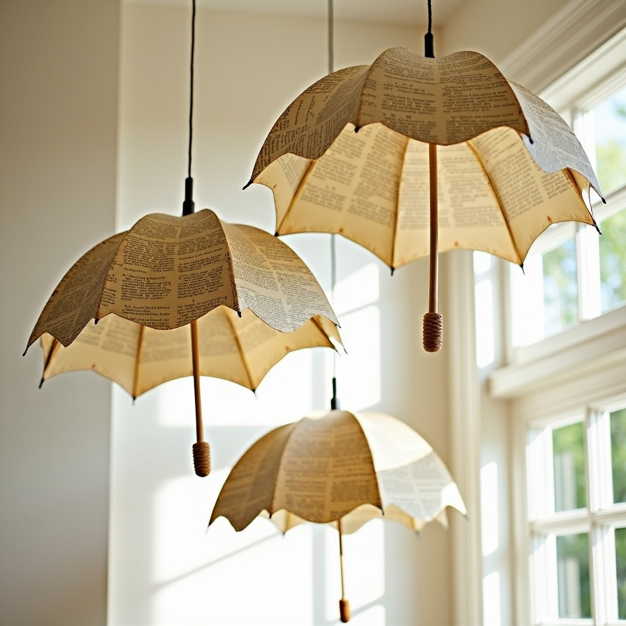 Hanging book page umbrellas create whimsical movement in any room. Crafted to mimic the shape and elegance of traditional umbrellas, these paper designs catch light and shadow beautifully. They are ideal for hanging from ceilings or in creative displays, adding both visual interest and a literary theme.