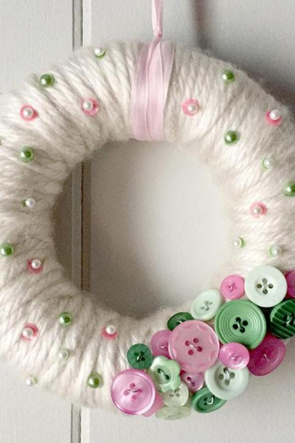 Soft yarn wreaths adorned with buttons bring subtle charm to any room. Cream-colored yarn accented by pastel pink and green buttons creates a cheerful, cozy look.