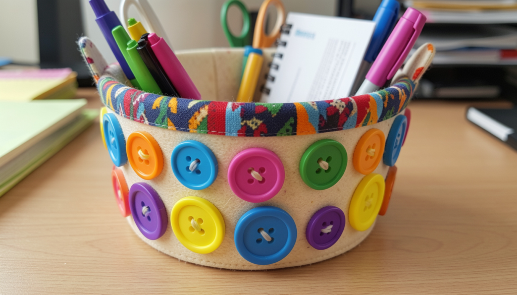 Use felt, oversized buttons, or contrasting patterns to create functional yet decorative containers. These baskets are perfect for organizing office supplies or craft materials while showcasing your creative flair.