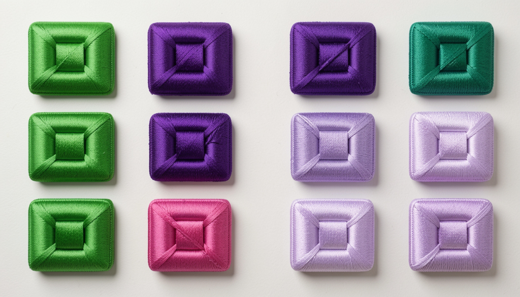 Geometric designs with buttons bring structure and creativity together. Vibrant patterns in green, purple, and lavender breathe life into fabric projects.
