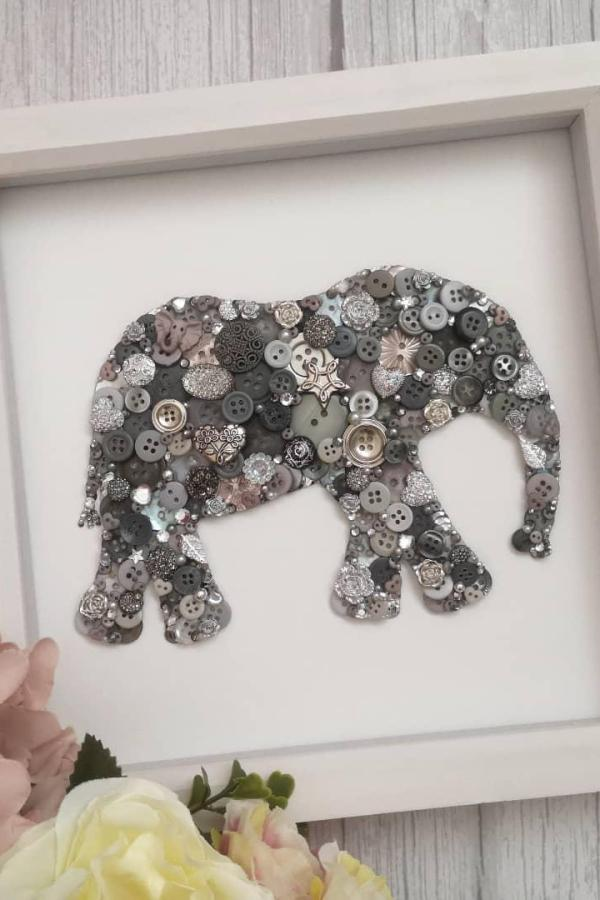 Transform buttons into stunning animal-themed art. A button elephant uses greys, silvers, and various textures to create a striking wall display.