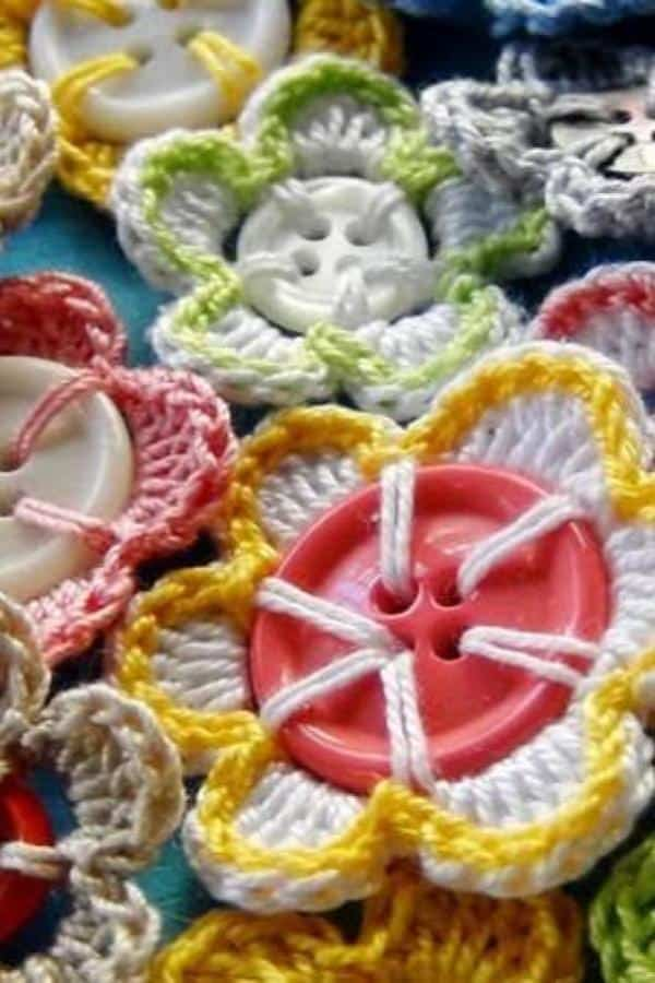 Crochet flowers paired with buttons make for whimsical, playful crafts. Colorful petals encircle vibrant buttons to create charming floral designs.