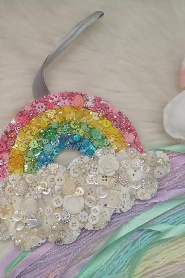 Rainbow-themed button art adds color and whimsy to any space. Cascading arcs of vibrant buttons above a soft, cloud-like base offer a playful yet structured design.