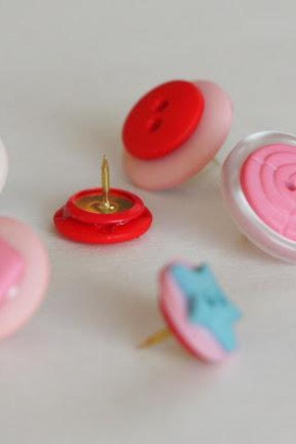 DIY button thumbtacks turn ordinary office supplies into colorful décor. Stack buttons in playful color combinations to create functional and decorative pins for boards.