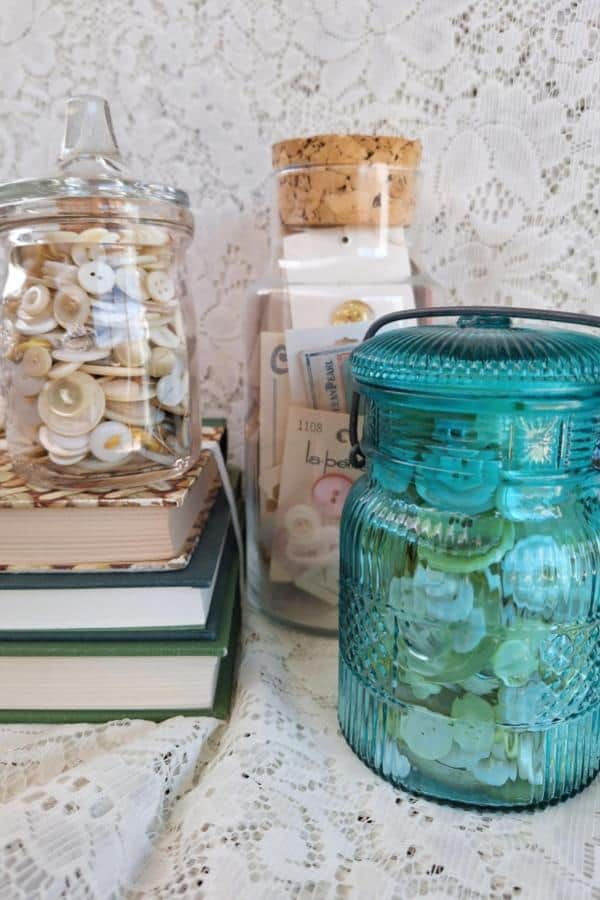 Decorative button jars provide an elegant way to display your collection. Glass jars filled with colorful buttons and layered with lace create a chic, timeless aesthetic.