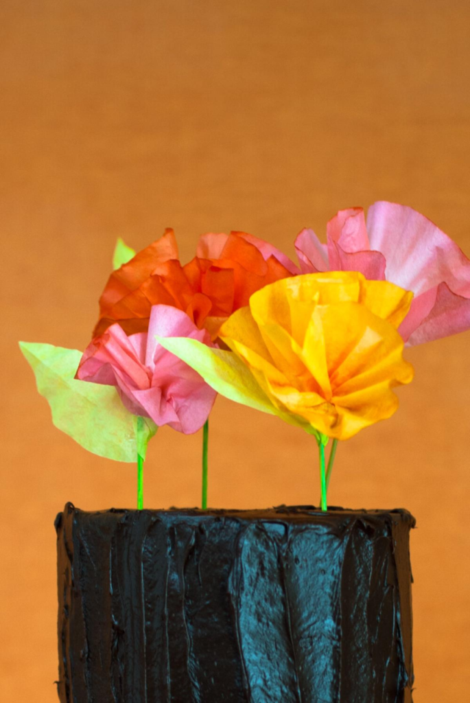 If you want a fast craft project, these two-step coffee filter flowers are perfect. First, dye or color the coffee filters using food coloring or watercolor paints. After they dry, simply attach them to toothpicks or small sticks to form stems. In just a few minutes, you will have bright decorative flowers. These mini blooms work wonderfully as cake toppers, table decorations, or festive party accents. Because the process is quick and easy, it is a great activity for groups, classrooms, or family craft time.