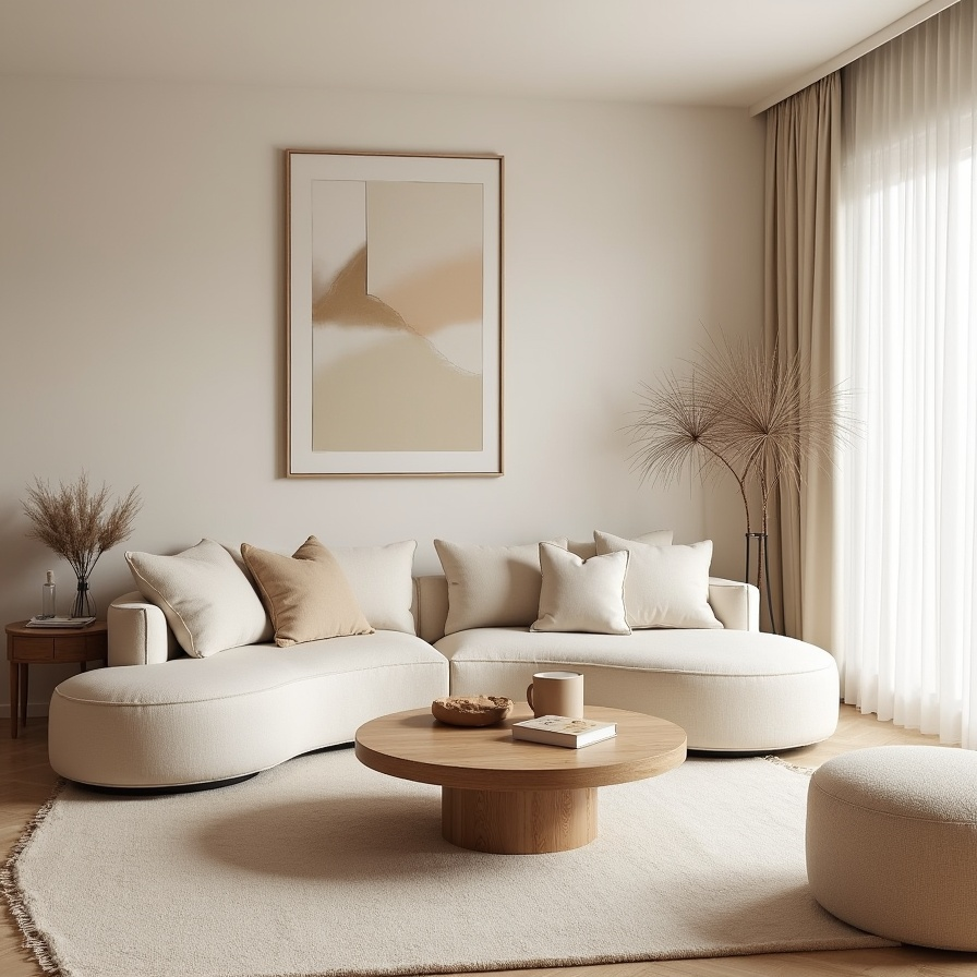 What truly brings this space to life is texture. The soft curves of the sofa, the subtle grain of the wooden coffee table, and the delicate folds in the curtains all add dimension without introducing competing colors. An oversized abstract artwork in complementary tones adds just enough contrast to keep the room visually engaging while staying within the warm neutral family. The result is a calm, welcoming haven that feels timeless and sophisticated without trying too hard.