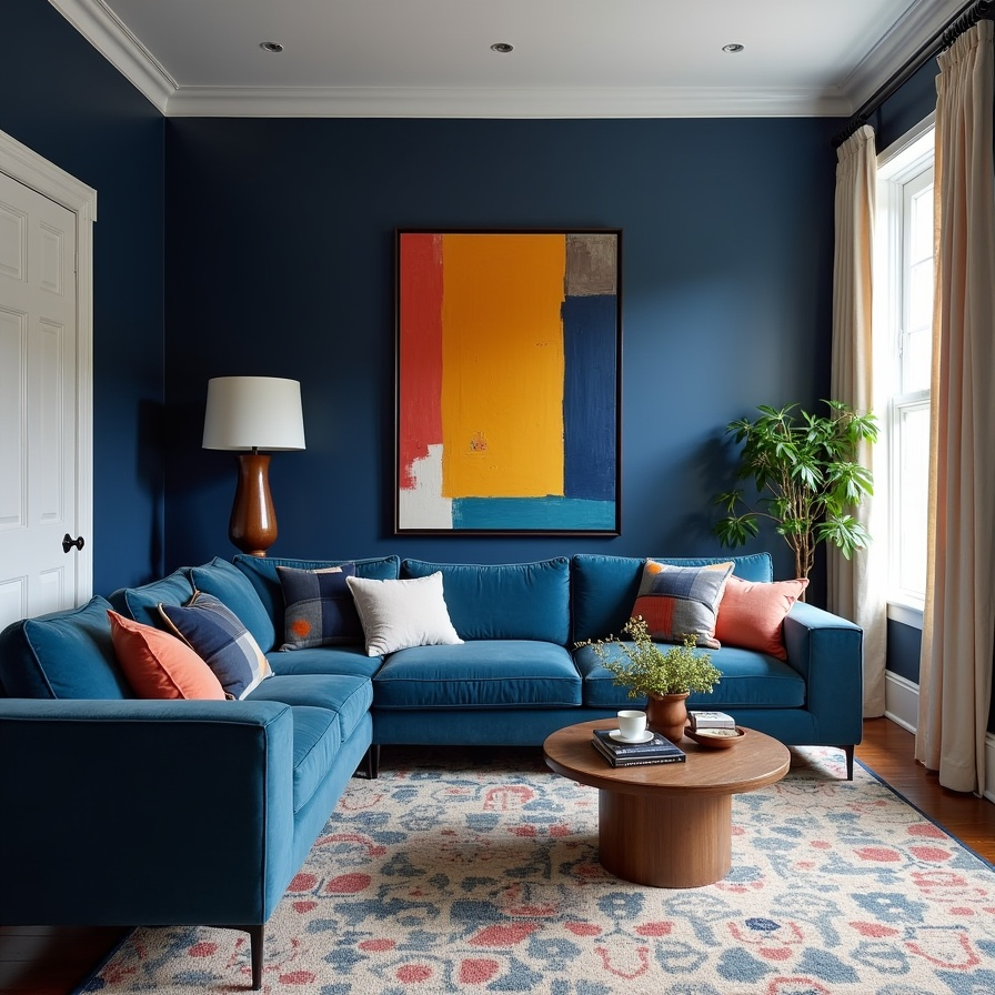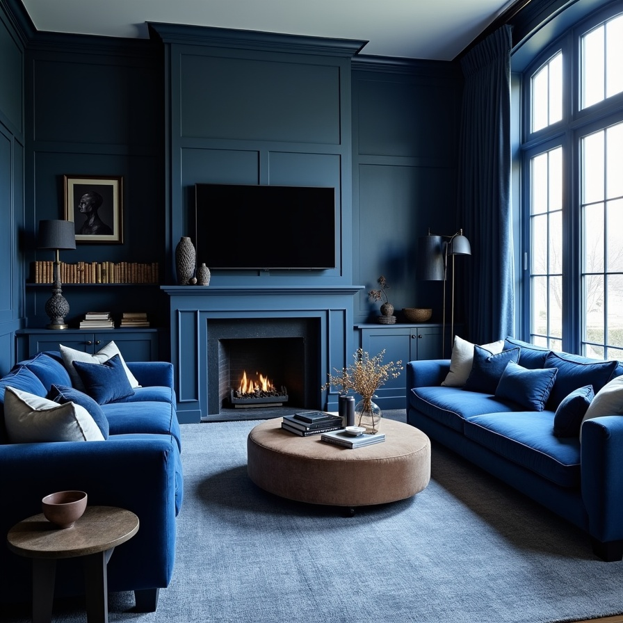 Drenching a living room in rich navy instantly adds depth and character. In this design, the walls, furniture, and curtains are wrapped in velvety blue tones that feel dramatic yet surprisingly cozy. Rather than overwhelming the space, the consistent shade creates a cocoon-like atmosphere that invites you to relax and unwind.
