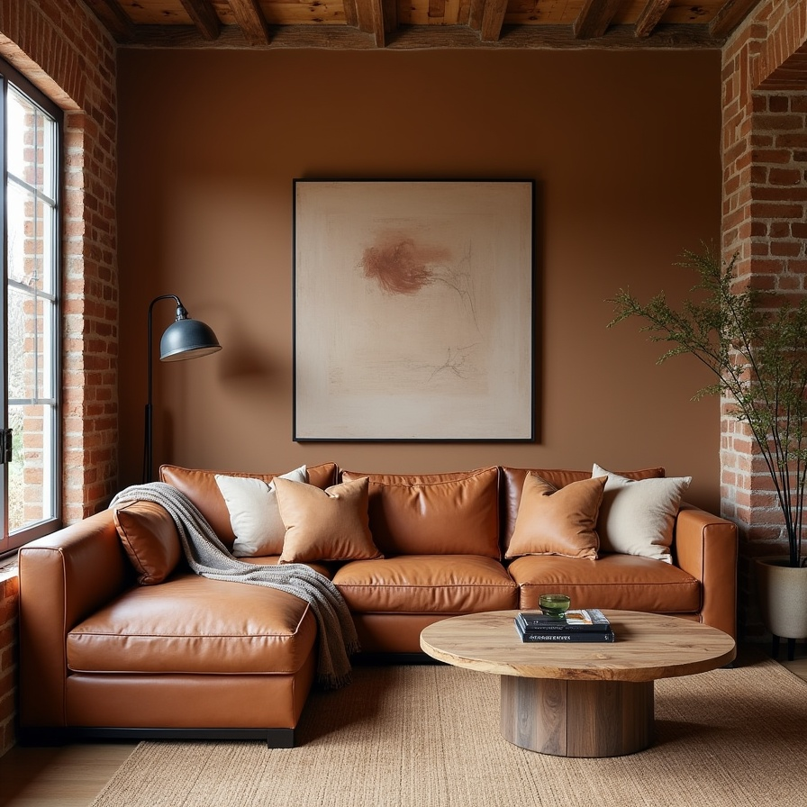Cinnamon brown wraps this living space in a grounded, natural warmth that feels both rustic and contemporary. The leather-inspired sofa and subtle brick textures enhance the earthy palette, giving the room a sense of authenticity and character. Because every major element stays within the same tonal family, the space feels cohesive and thoughtfully curated.