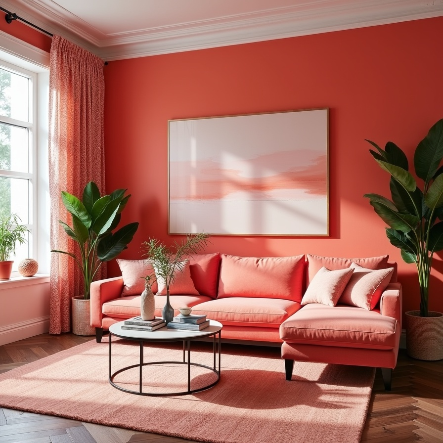 Coral brings a lively and uplifting spirit to a living room, especially when used generously. By extending the shade across the walls and sectional sofa, the room feels cohesive and full of personality. The bold color choice instantly transforms the space into something cheerful and dynamic.