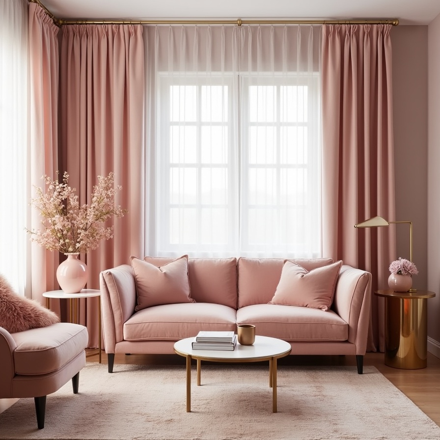 Dusty rose offers a more muted take on pink, bringing elegance and subtlety to a monochromatic living room. When the sofa, drapes, rug, and walls share this refined hue, the space feels unified and serene. The soft velvety textures elevate the look, making it feel modern yet timeless.