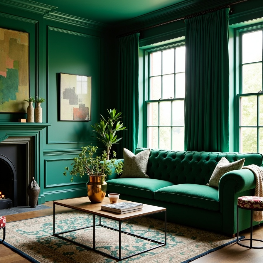 Emerald green instantly creates a sense of drama and richness. In this living room, the jewel tone envelops the walls, drapery, and tufted sofa, resulting in a bold yet harmonious environment. The consistent use of color makes the space feel immersive and luxurious.